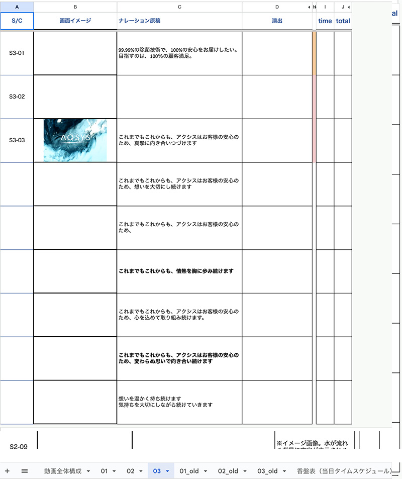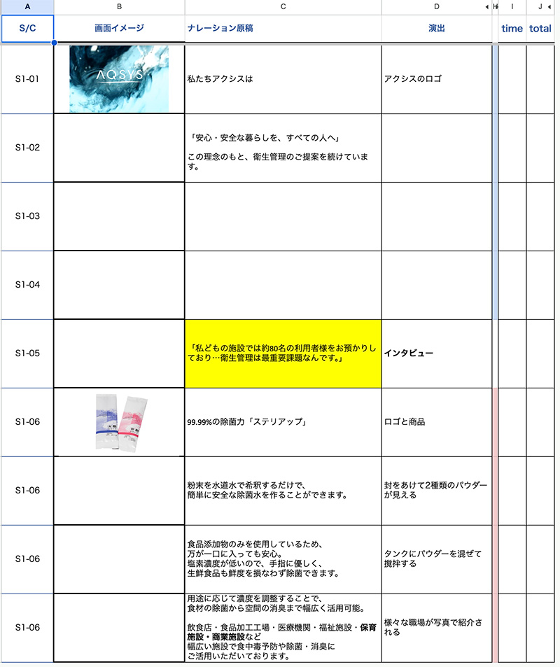 絵コンテで撮影内容を綿密に詰めていく。社内のプロデューサー、ディレクター、ライターがアイデアを出し合い、構成を作り込む。作成はクラウド上で行い、Googleスプレッドシートを共有。クライアントサイドも気軽にコメントバックができる体制を整えている。ナレーターも読み合わせに参加し、全員が同じ方向を向いてプロジェクトを進行させる。