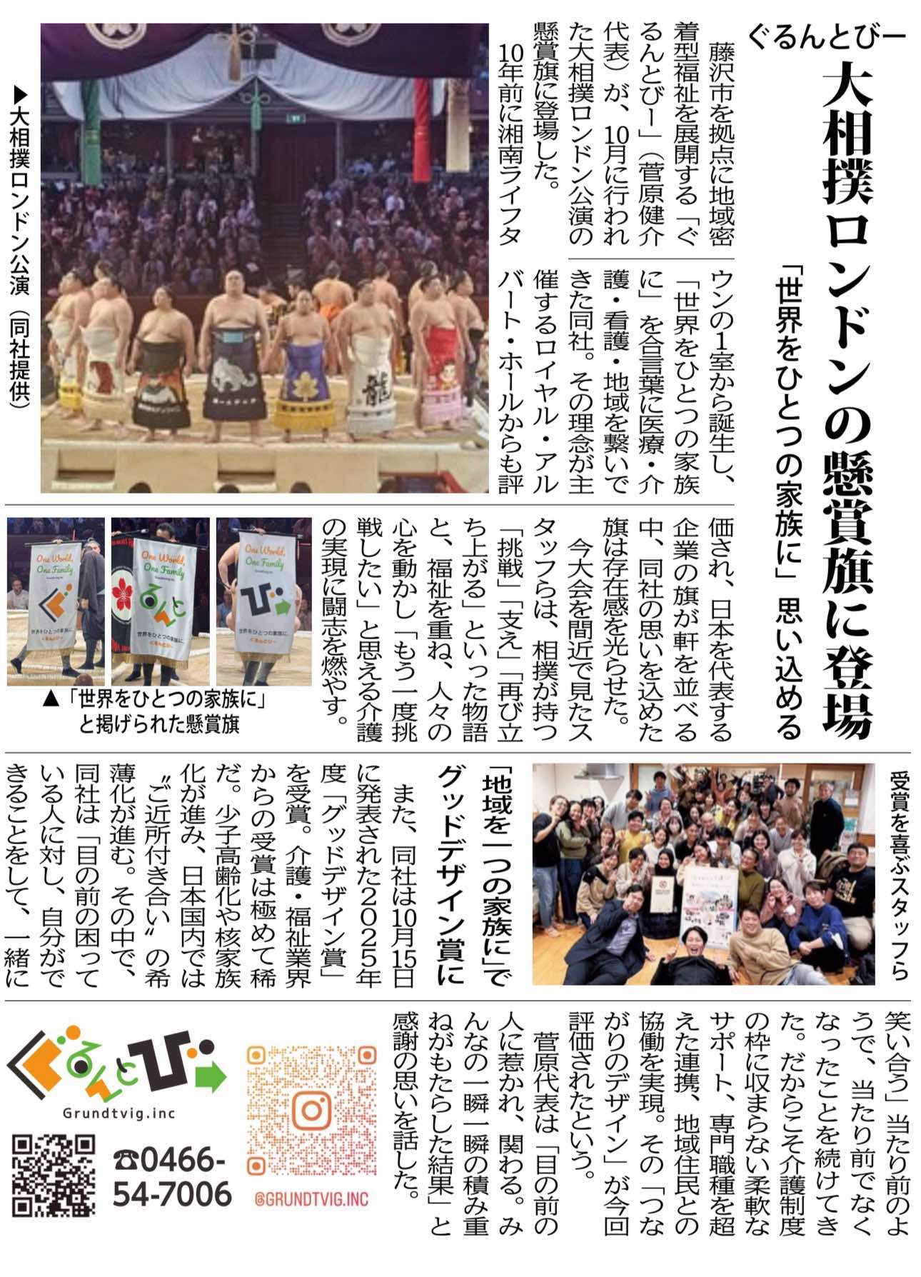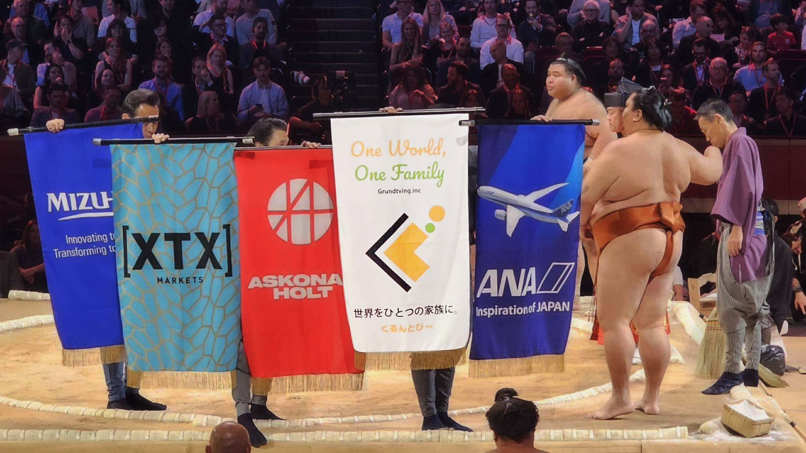 世界的文化施設ロイヤル・アルバート・ホールで2025年10月に開催された大相撲ロンドン公演に、ぐるんとびーの懸賞旗が登場した。その懸賞旗のデザインもU-MAにお任せいただいた。『One World One Family(世界をひとつの家族に)』というメッセージは、ぐるんとびー発足当時より代表の菅原様が唱えていた基本精神。クリエイティブの引き出しを限定しないU-MAだからこそ、クライアントの要望に柔軟かつスピーディーに応えることができる。